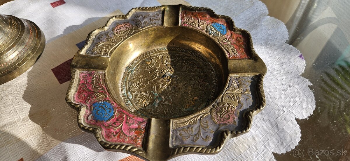 Predám originálnu indickú tepanú kolorovanú vázu s popolníkom. Signovanú výrobným číslom ručnej výroby.Vaza 30x10cm,poolnik 13x2cm.
