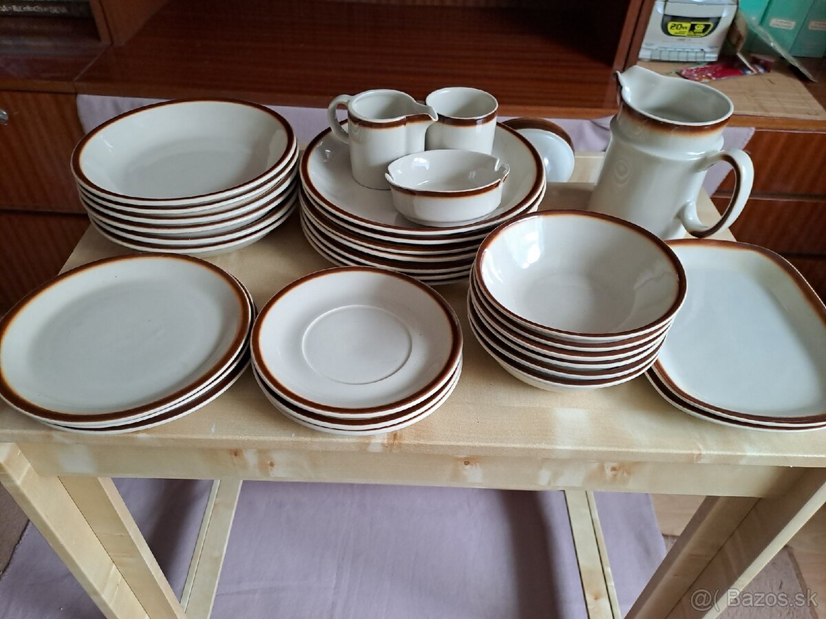Predám obedovú súpravu: taniere hlboké-6 ks, priemer 21 cm, taniere plytké-7 ks, priemer 24 cm, misky-6 ks, priemer 16 cm, výška 5 cm, taniere dezertné-3 ks, priemer 29 cm, podšálky-3 ks, priemer 17 cm, taniere plytké obdĺžnikové- 2 ks, 23x17 cm, popolník- 1 ks, džbán- 1 ks, výška 14 cm.