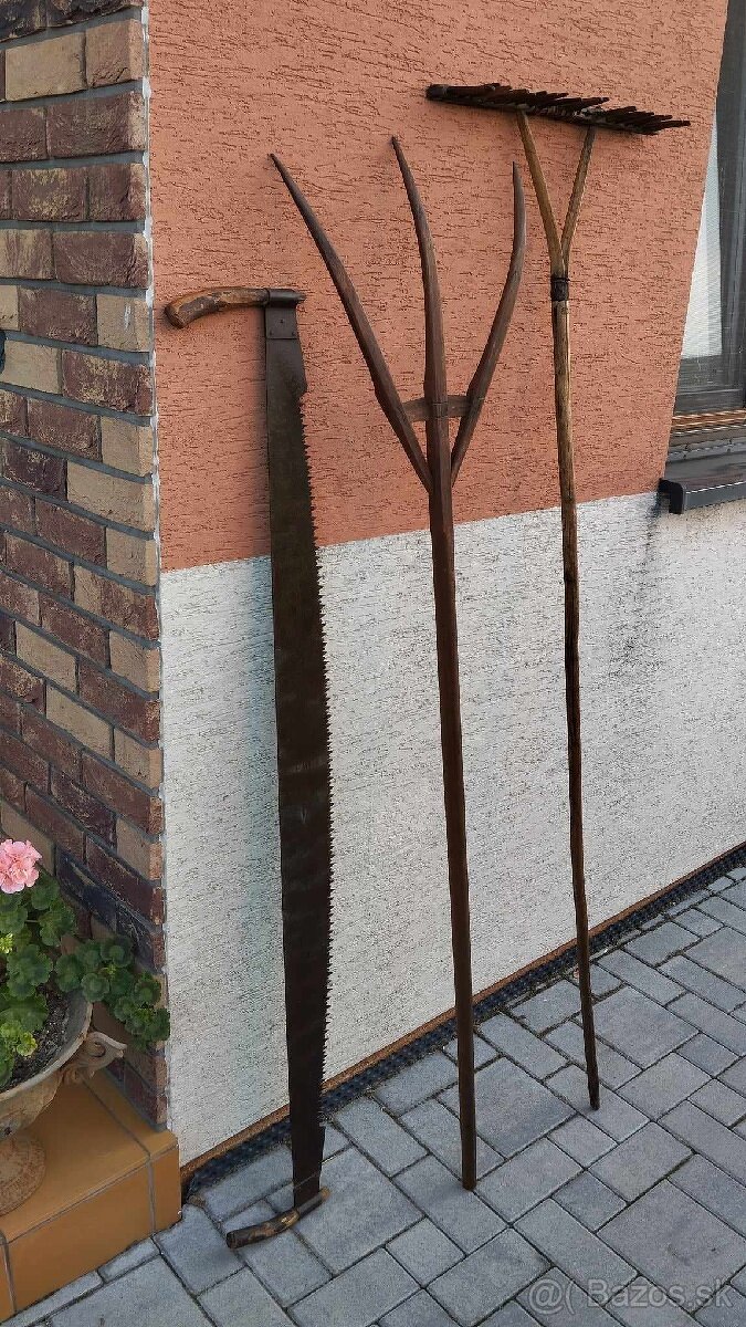 Predám staré vidiecke / farmárske náradie viď. foto vhodné ako dekorácia na chatu / chalupu - píla, vidle, hrable.