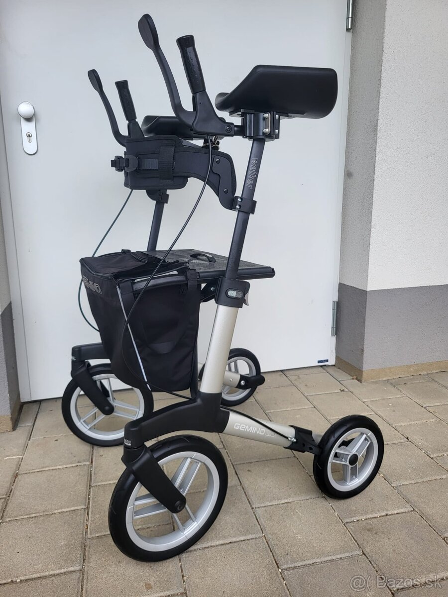 Chodítko Sunrise Medical Gemino 60 s veľkými prednými kolesami je ideálne ako vonkajší vozík. Má tiež nastaviteľné barle na predlaktie . Dajú sa nastaviť na výšku a uhol a majú integrovanú brzdu a rukoväte na tlačenie.