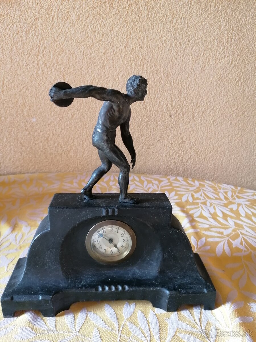 Predám secasné starožitné funkčné hodiny so soškuo diskara, V27, dĺžka 25 cmm