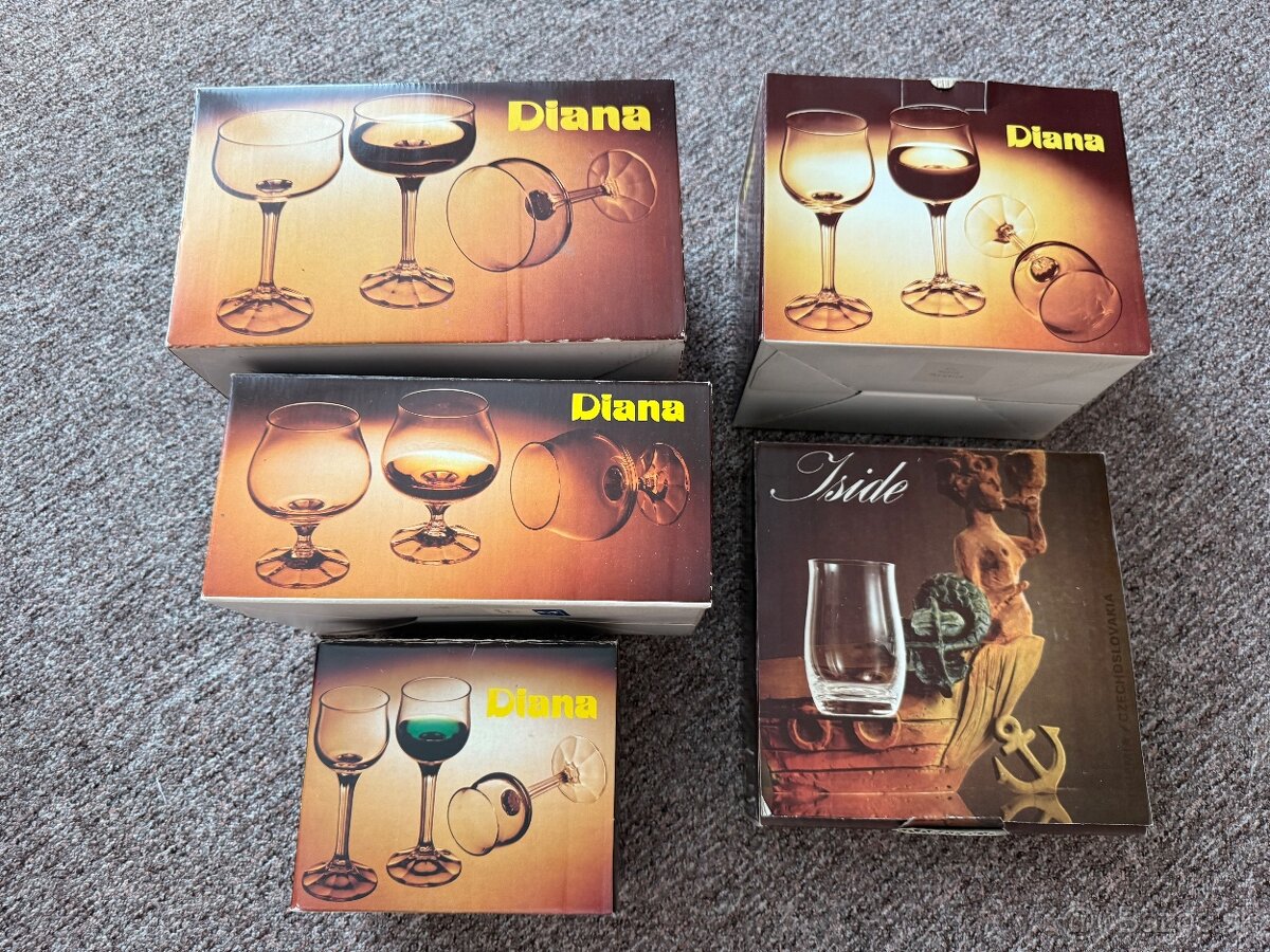 Predam nikdy nepoužitú sadu pohárov Diana z Československa. Nepoužívané v original krabiciach bez poškodenia.