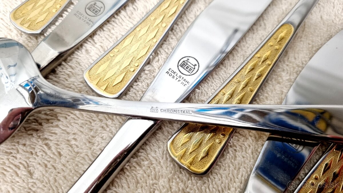 Predám kompletnú 70ks sadu príborov pre 12 osôb značky Carl Schmidt Solingen 1829 Nemecko Nemecko (originál z mesta Solingen). Príbor je v kompaktnom kufríku s dvoma organizérmi, ktoré je možné preložiť priamo do príborníka. Vzor tvrdo pozlátený zlatom s prímesou kobaltu, vhodný aj do umývačky riadu v kompaktnom kufríku. Kvalitný príbor je vyrobený s vysokokvalitnej nehrdzavejúcej ocele CHROMSTAHL 18/0 (vhodná aj pre alergikov na nikel), dozdobený 23/24 karátovým zlatom, 40-50 ročná sada, kvalita preverená časom. Porcelánová obedová súprava zlatá s týmto príborom získa na luxuse. Na spôsobe dodania sa vieme dohodnúť. Príborová sada je vhodná aj ako darček . Pozrite aj moje ďalšie inzeráty stačí dať vyhľadať moje tel. číslo, mám toho viac.