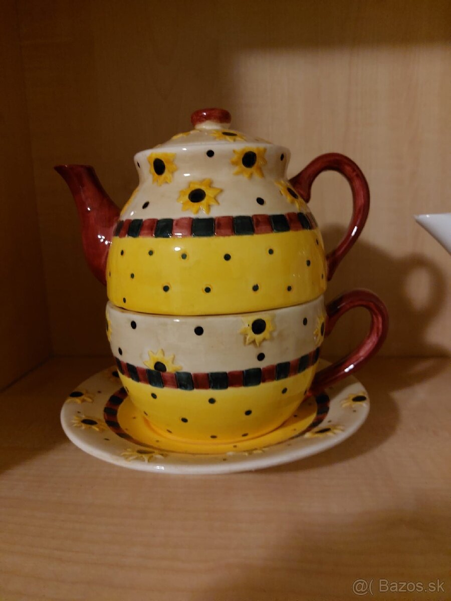 Predám keramický čajník so šalkou, vystavený ako dekoracia.