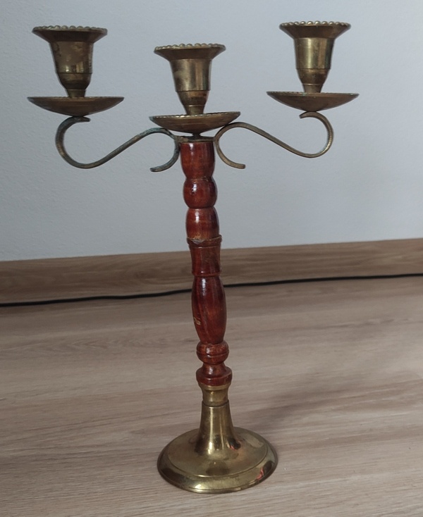 Predám používaný, 3-ramenný svietnik, mosadz+drevo, výška 31 a šírka 22 cm. Pôvodne 29€, teraz len 14,99€
