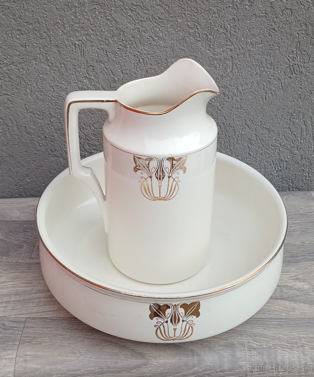 Starožitná keramická súpravu džbán a umývadlová misa , často označovaná ako súprava na umývanie, alebo toaletná súprava. Je vyrobená z bielej keramiky a je zdobená secesným dekorom v zlatej farbe. Obsahuje džbán na vodu a širokú plytkú misu. Tieto súpravy boli bežné v domácnostiach pred zavedením tečúcej vody. V súčasnosti sú vyhľadávané ako zberateľské predmety , alebo dekorácie. Používaná – umývadlová misa má prasklinu .
