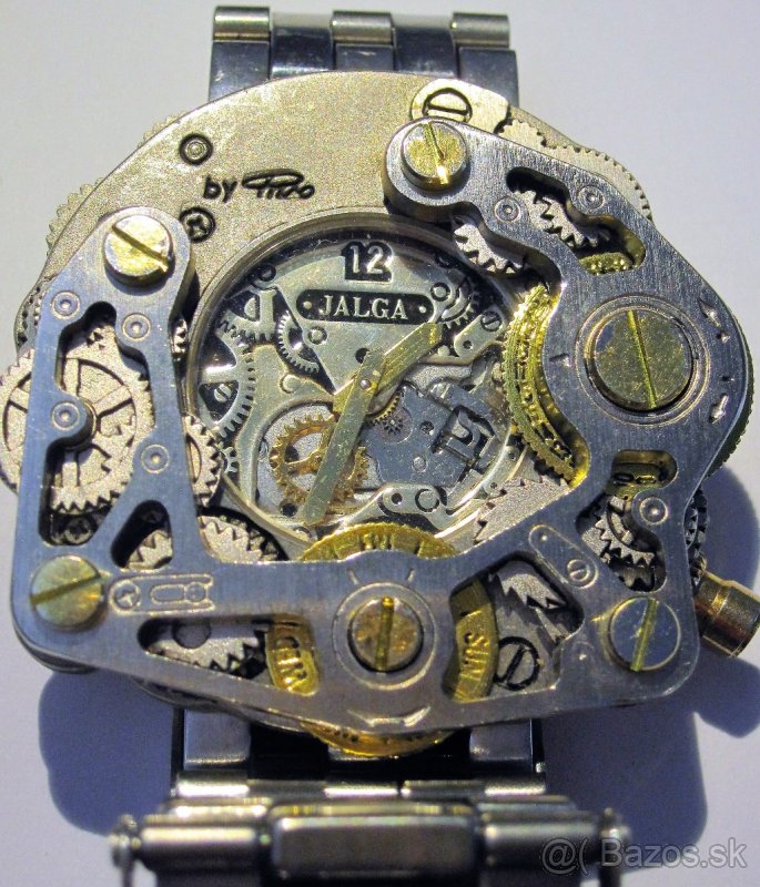 Vzácne zberateľské 80s WRIST-GEAR UK náramkové hodinky z nerezovej ocele anglickej výroby s výrobným číslom, funkčné,po generálnej oprave, štýl Star Trek. Sklo na povrchu umožňuje vidieť pohyb strojčeka. Náramok nie je pôvodný. Materiál mosadz, striebro a nerezová oceľ.