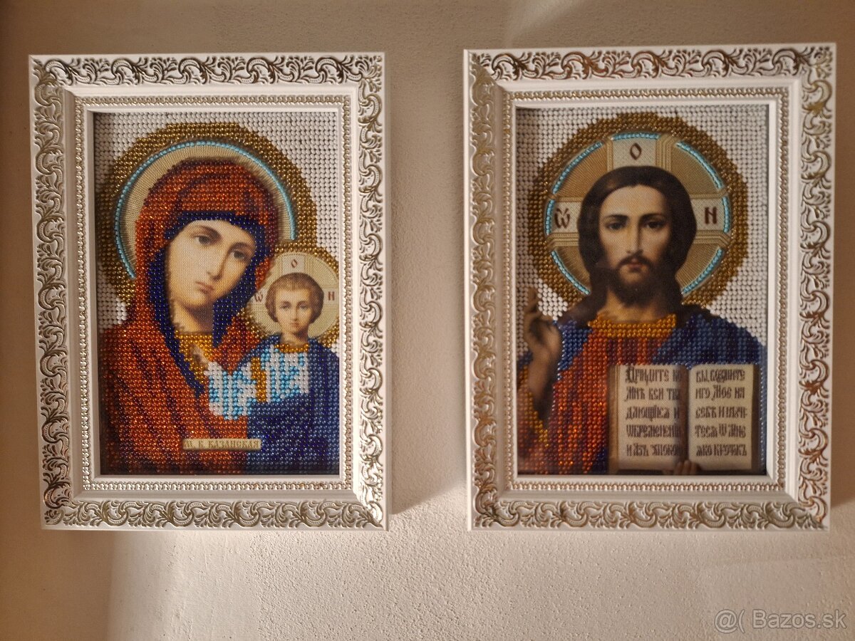Vyšívané obrazy/ ikony so sklenenými korálkami Ježiš a Panna Mária.Obraz,ikona. Ručná, kvalitná práca, pod sklom s ozdobnými rámami.Rozmer 20x15 cm. Cena spolu 33,30 eur.