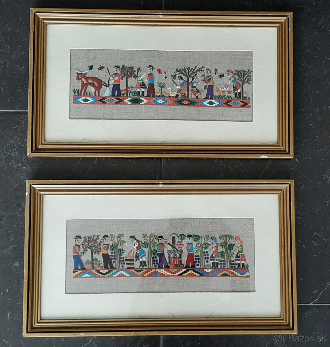 Predám dva vyšívané obrazy - slovenská farebná výšivka na režnom plátne, s motívmi ľudového života. Paspartované, zasklené, zarámované.