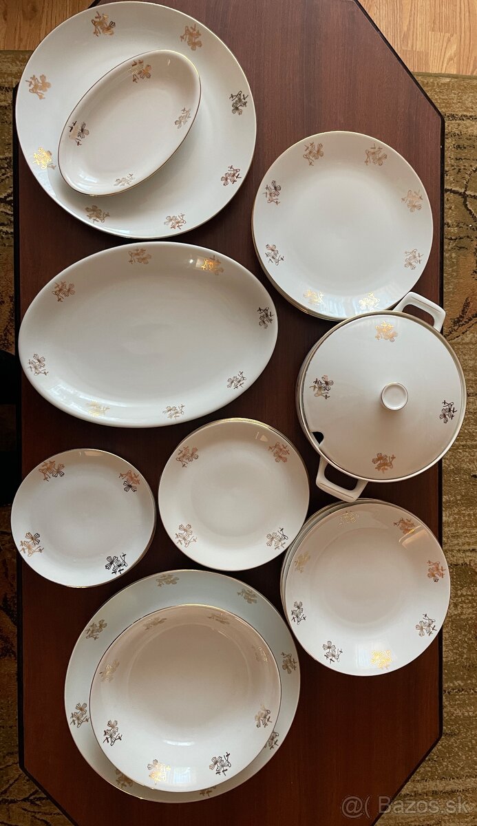 Obsahuje polievkovú misu, 4 servirovacie misy, 6 dezertnych tanierov, 5 trochu väčších dezertnych tanierov, 2 plytké, 5 hlbokých tanierov, malá oválna miska. Zlatý dekor. Všetky časti sú v poriadku, neobité.