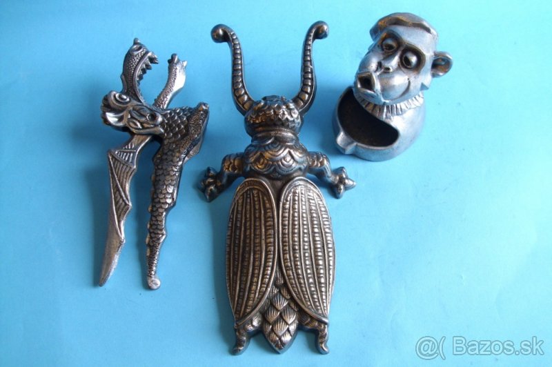 Popelník opička. Na boku značeno WR. Výška 10cm, Materiál nějaká těžká slitina-není to olovo. Při odložení cgarety do popelníčku, stoupá vzhůru dým opičce z tlamičky. Cena je 140 Eúr. Louskáček na ořechy, materiál nějaká těžká slitina-není to olovo, délka 20cm. Cenu ponůknite. Zouvák na boty, materiál litá litina, 26cm. Cenu ponúknite.