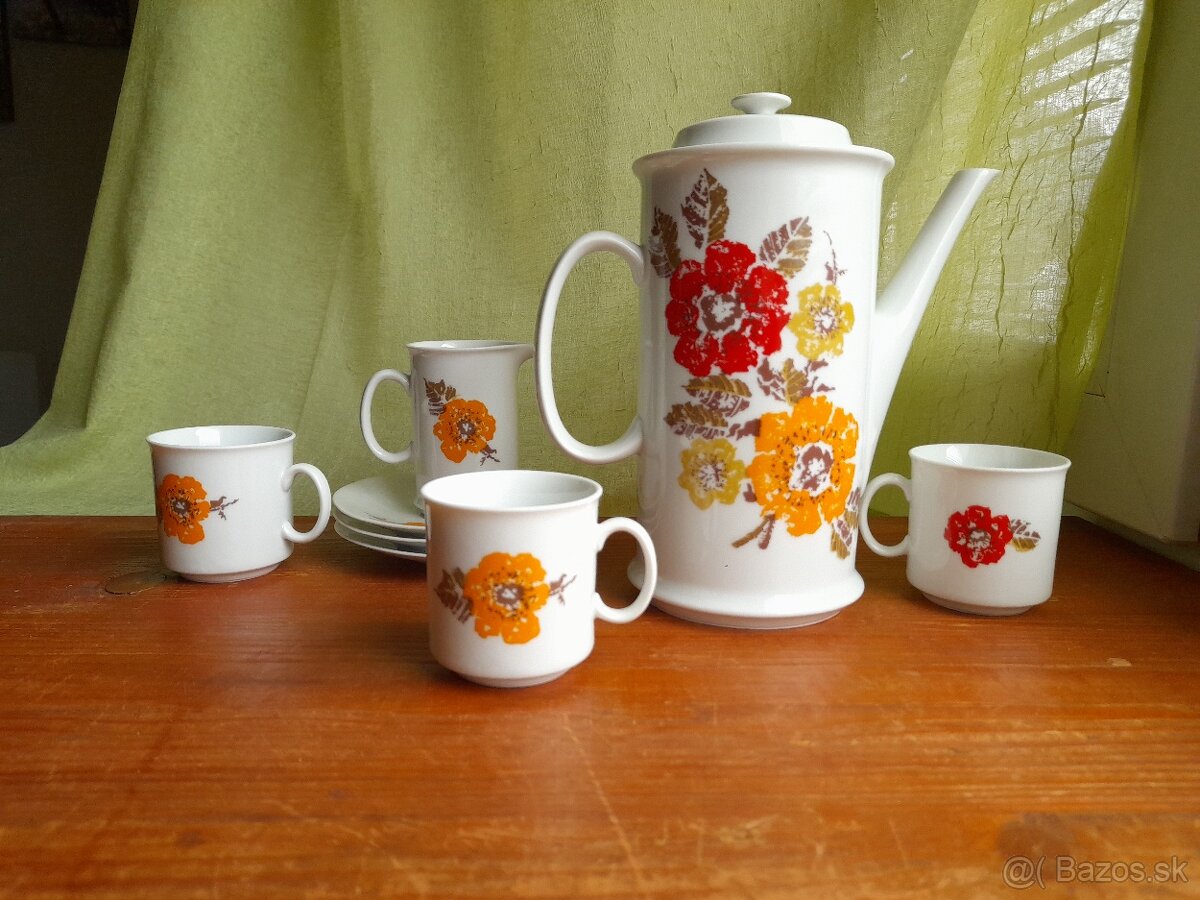 Nádherný vintage kúsok. Krásne zachovalý stav, bez prasklín, vyblednutia či straty glazúry. Miestami výrobné nedokonalosti, typické pre staršie porcelánové kúsky ako malý výstupok, či bodka. Dolný zelenkavý symbol potvrdzuje pravosť porcelánu. Sada zahŕňa: 1x kanvicu, 3x tanierik, 1x šálka na mlieko, 3x šalka na kávu. Kontakt len cez sms prosím. K cene počítajte s poštovným. Možný samozrejme aj osobný odber.