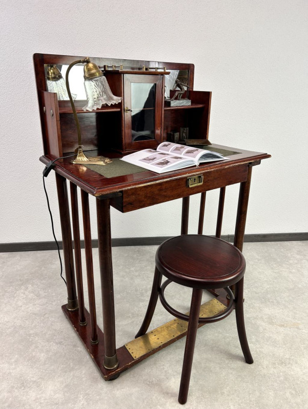 Menší secesný mahagonový stolík Pre secesiu typická účková podstava okovaná mosadzou ,stlpové nôžky osadené mosadznými papučami , plato potiahnuté zelenou tkaninou, presklená skrinka s poličkami kvalitne vypracovaný model v štýle Viedenskej secesie 1900
