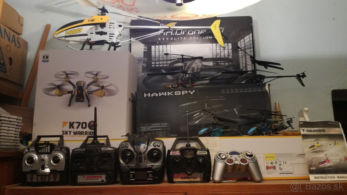 Ponúkam na predaj funkčné RC-Vrtulníky-drony+diaľkové ovládania(diaľkové sú plne funkčné)ktoré sú na fotkách.Niektoré vrtuľníky sú vhodné na opravu,alebo diely-možno batéria.Mám aj rozne náhradné diely.Ak máte záujem o konkrétny typ,cenu ponúknite,alebo sa dohodneme.Kontakt mailom alebo sms.