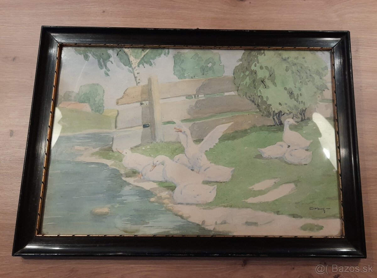 predám starožitný obraz s prírodným motívom (husi) 49×34 cm.
