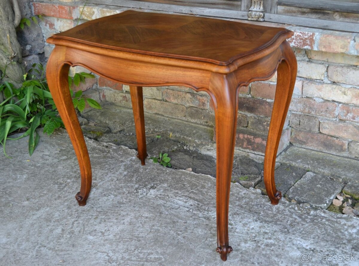 Pekný stôl z orechového dreva. zdobený peknými vyrezávanými detailmi a zaoblenými líniami.