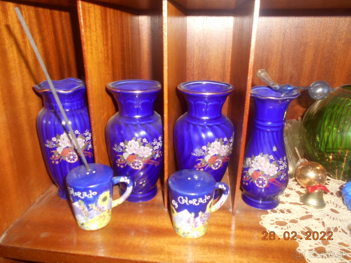 1/Ponúkam na predaj peknú modrú porcelánovú súpravu váz rôzného tvaru s rovnakým krásnym kvetinovým motívom.U všetkých je horný okraj zdobený zlatým prúžkom.Výška je 14 cm.