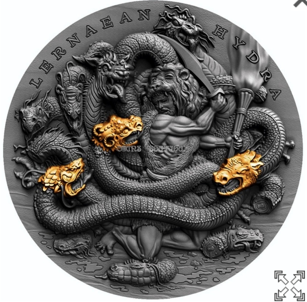 Táto krásna strieborná minca 2 Oz je druhým vydaním zo série „Dvanásť prác Herkula“, venované jednej z dvanástich prác – Lernaean Hydra. Minca má neuveriteľné pozlátenie, má skvelý vysoký reliéf, má starožitnú kvalitu a dodáva sa v tematickom obale spolu s certifikátom pravosti. Náklad je obmedzený na 500 kusov po celom svete!!!