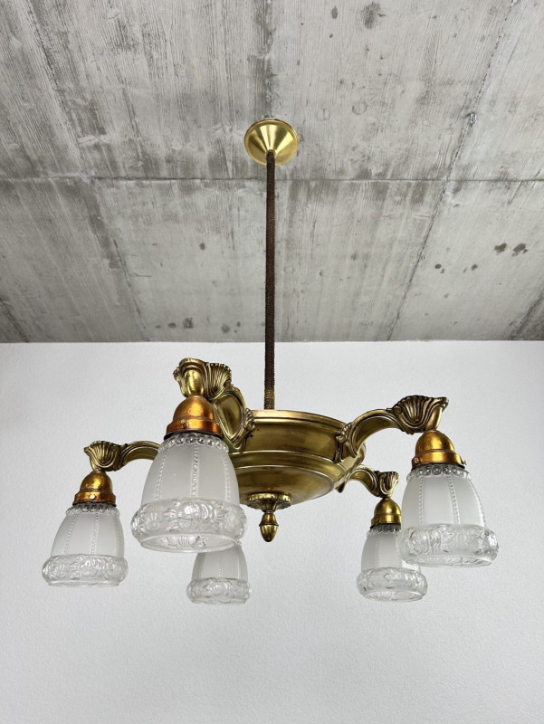 Starožitný mosadzný 5ramenný luster plasticky tvarované sklenené tienidlá s dekorom ruží po obvode a matovaním nosná tyč opletená mosadznou zlátenou šnúrou