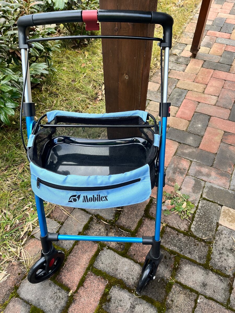 Vybavené je dvoma brzdami s parkovacou funkciouIde o modrý interiérový kolieskový chodítko Mobilex Jaguar.