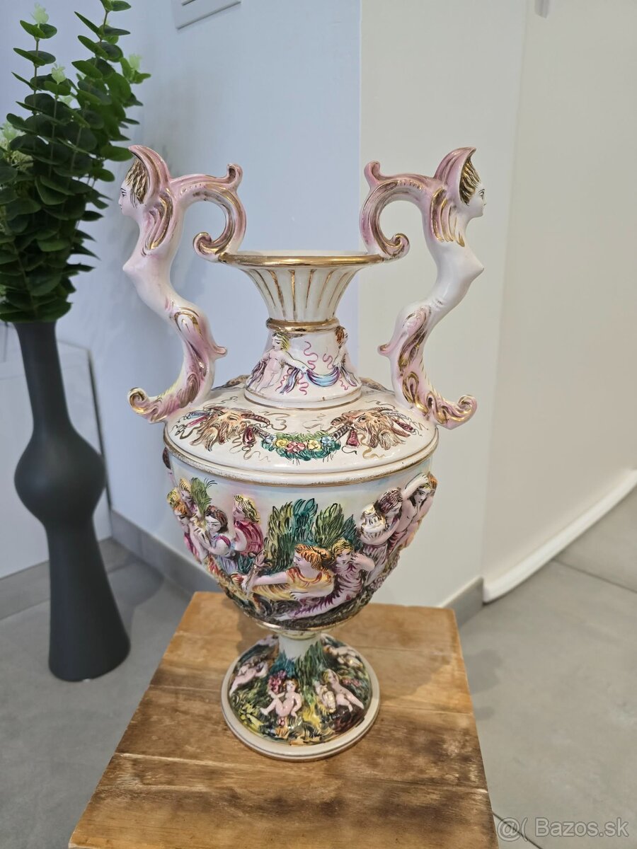 Motív: Detailné figurálne reliéfy (mytologické scény, nymfy/postavy v prírode), hlavy boha Pana (saturovia) a kvetinové girlandy. Rukoväte: Unikátne tvarované uši v podobe ženských postáv (najád). Materiál: Ručne maľovaný porcelán so zlatými akcentmi. Pôvod: Originálna talianska výroba (značené na spodnej strane: "Capodimonte Italy" + sériové číslo). Rozmery: Výška cca 42 cm (viď foto s metrom). Stav: Váza je vo veľmi zachovalom stave, farby sú jasné, bez výrazných mechanických poškodení (vhodná pre zberateľa alebo ako luxusný doplnok do interiéru).