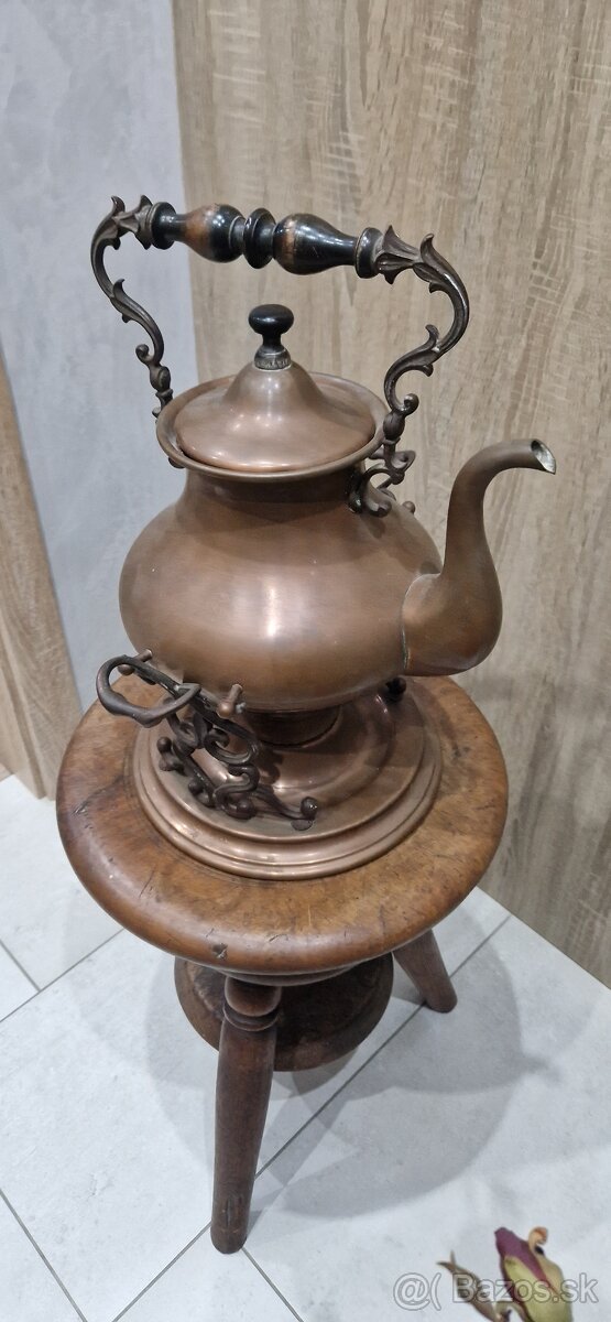 Predám starožitný medenný čajník s podstavcom. Priemer podstavca je 23cm a výška aj s uchom je 37,5cm.