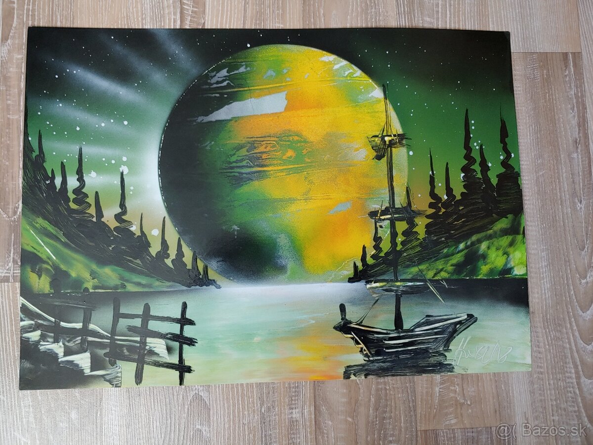 Predám obrazy, technika maľovania - striekané sprejom, nezarámované, cena za ks 9€. Maľované obrazy: "stromy" (šírka 85 cm, výška 60 cm) za 14 € a obraz na ráme za 24€.