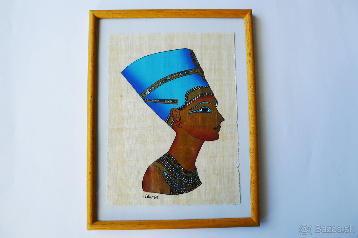 Signovaná maľba na egyptskom papyruse, pod sklom v drevenom ráme so stojanom.