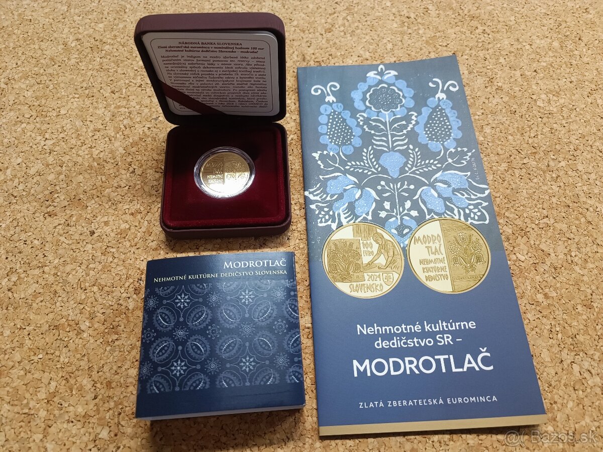 Predám zlatú zberateľskú euromincu: Nehmotné kultúrne dedičstvo Slovenska – modrotlač v etui s certifikátom, letákom a pamätným listom.