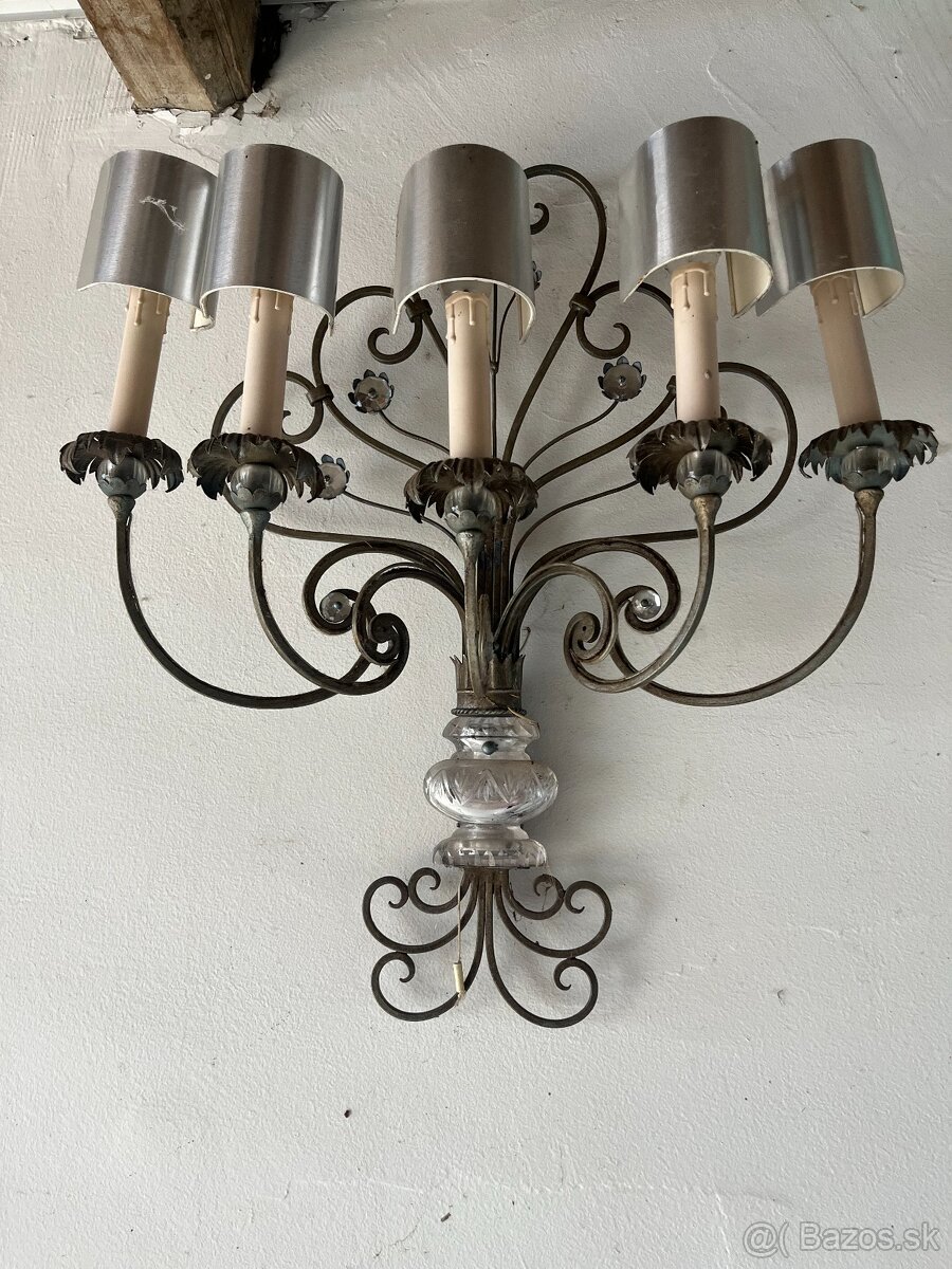 Veľké francúzské nástenné svietidlo v štýle Maison Bagues z polovice minulého storočia z brúseného křištálu a kovu. Rozmer: výška 68 cm, šírka 60 cm