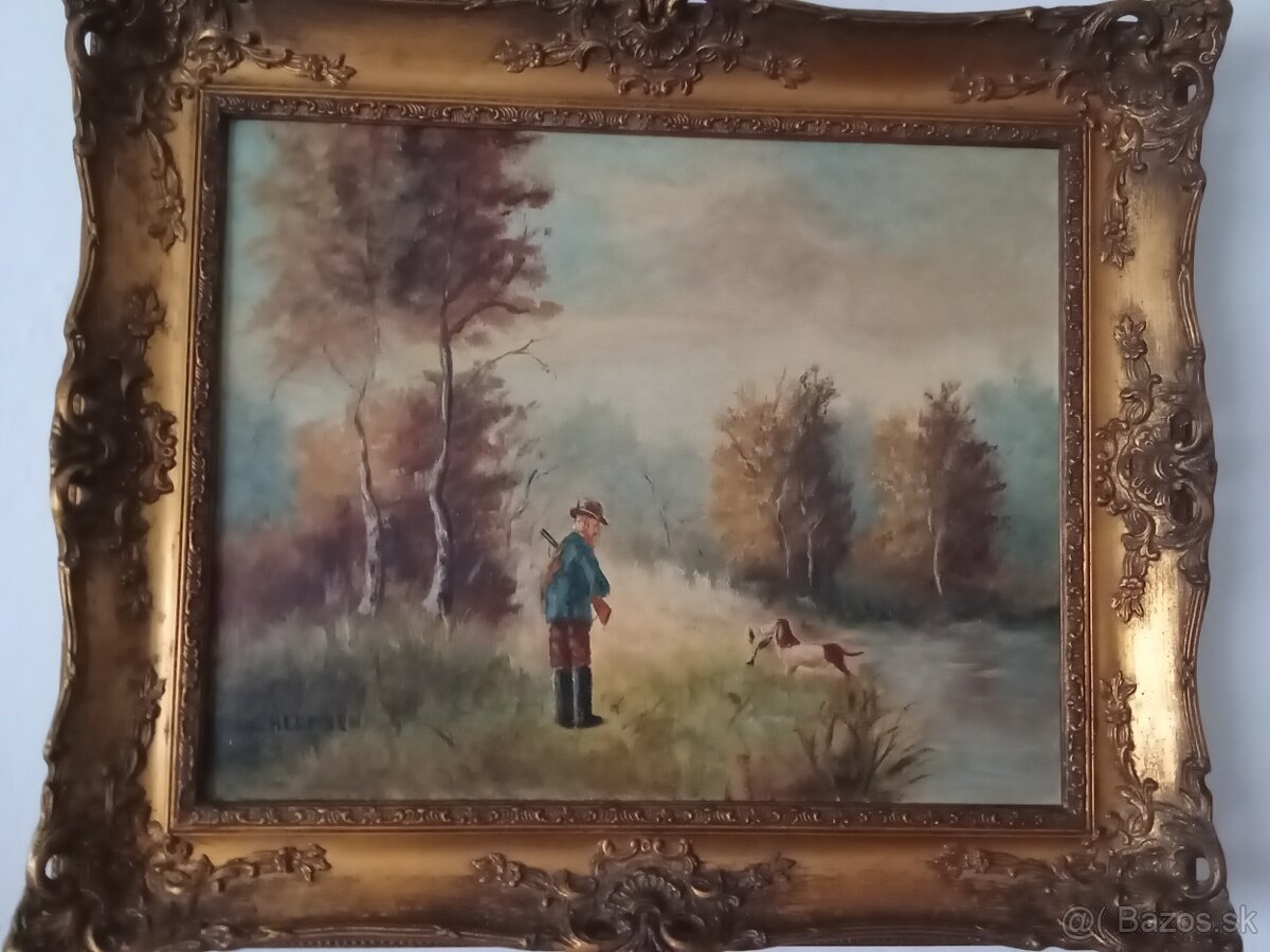 Milovníkom krásnych vecí a starožitností ponúkam tento jedinečný originál olejomaľby na plátne z Holandska. Poľovnícky motív je zarámovaný v nádhernom pozlátenom barokovom ráme. Dielo pochádza približne z konca 19. storočia. Signované vľavo dole. Rozmery obrazu sú 63 x 53 cm.