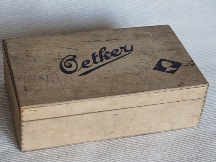 Drevená krabička Oetker s dokladmi.