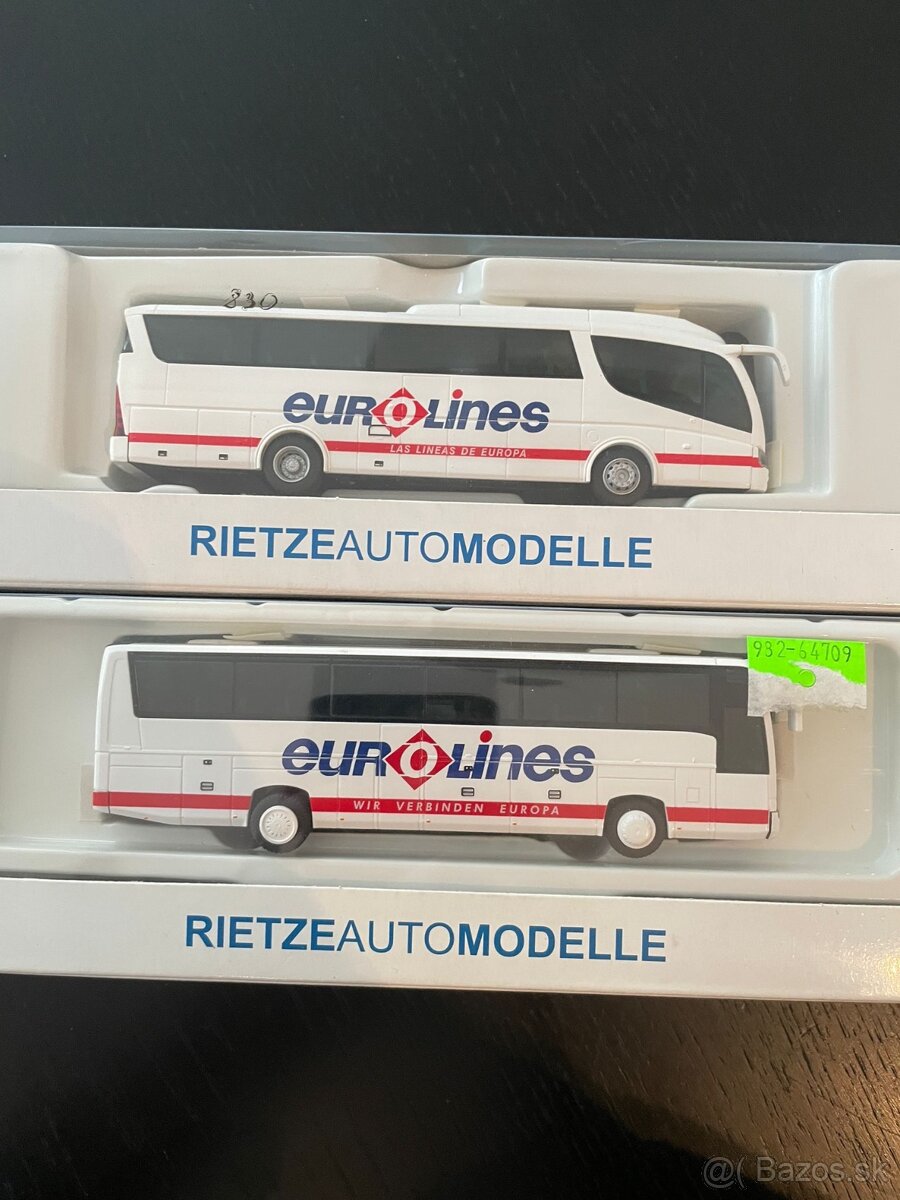 Nove modely autobusov Eurolines Rietze a TAD Trutnov AWM v mierke H0 1:87, nove, s doplnkami, original krabicky, cena za kus 50 Eur / 1300 Kc.