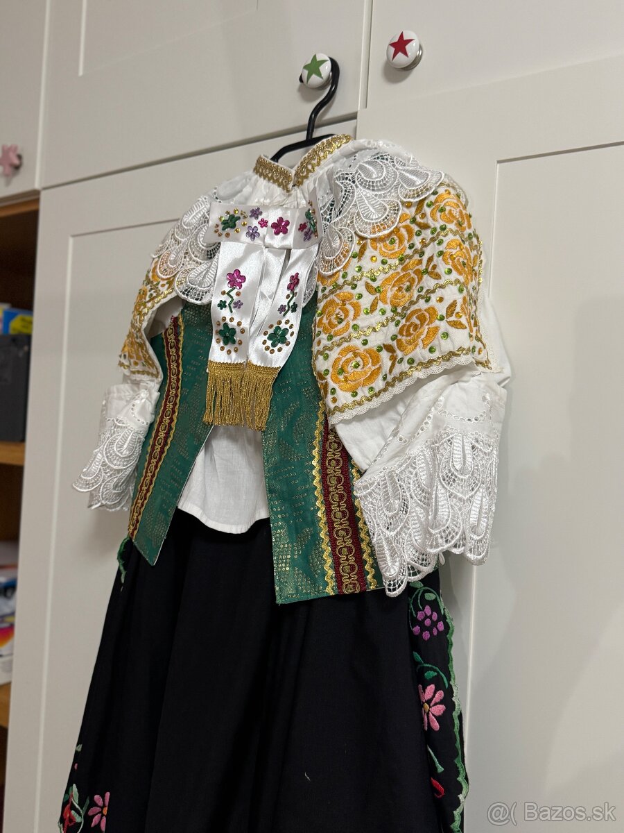 Predám kompletný trnavský kroj, ktorý používala dcéra v súbore = spodnica, rukávce (vrchy), prucel (lajbel), zástera, krezel, tacle, masla pod krk, čepiec, zadná masla, stuha okolo pása. Ručne vyšívané karty / rukávce, ručne vyšívaná zastera (dlzka 64 cm), ručne vysivany čepiec.