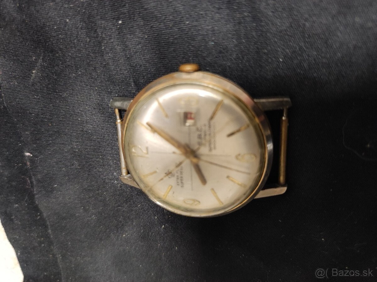 Predám zberateľovi pánske nemecké mechanické hodinky ,ERC Super de luxe-17jewels,super calendar ,vyrobené medzi rokom 1955-1968,hodinky idú ,sekundova ručička sa hýbe ,po pohybovani nimi sa môžu zastaviť ,vhodné na servis -precistenie ,,majú pozlátené prvky ,s datumovnikom ,sklíčko na jemnú prasklinu ,,