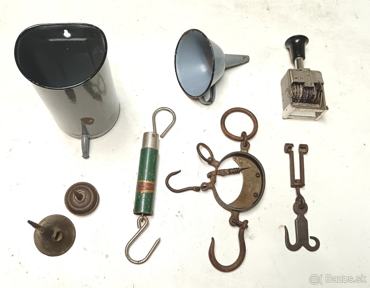 Rôzne staré veci. Starý kovový pohár na zmrzlinu 10€. Liatinová palička na mäso dĺžka 22cm 8€, Plechová dóza Karlsbaden Czechoslovakia 7€, váha 8€, dóza 7€, Spofaplast 6€.