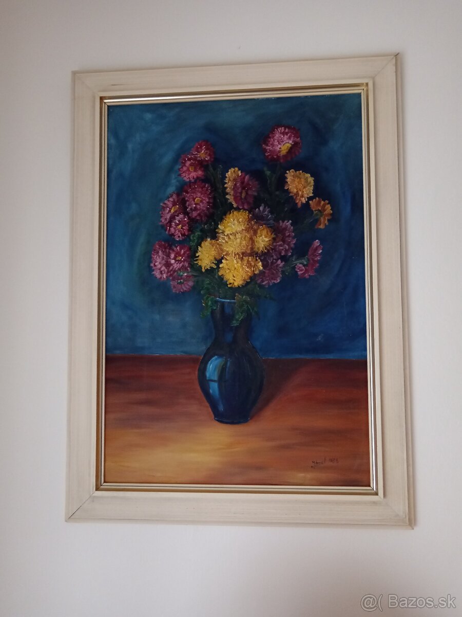 Predám starší, veľký maľovaný obraz kvety, v dokonalom stave, drevený rám, SIGNOVANE vzácne dielo. 90x67cm