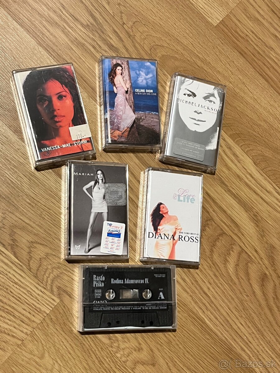 Predám tieto originálne magnetofónové kazety. Set obsahuje kazety interpretov ako Diana Ross, Whitney Houston, Celine Dion, Vanessa Mae a komediálna kazeta Rodina Adamsovcov IV a z druhej strany Rasťo Piško Listy premiérovi III