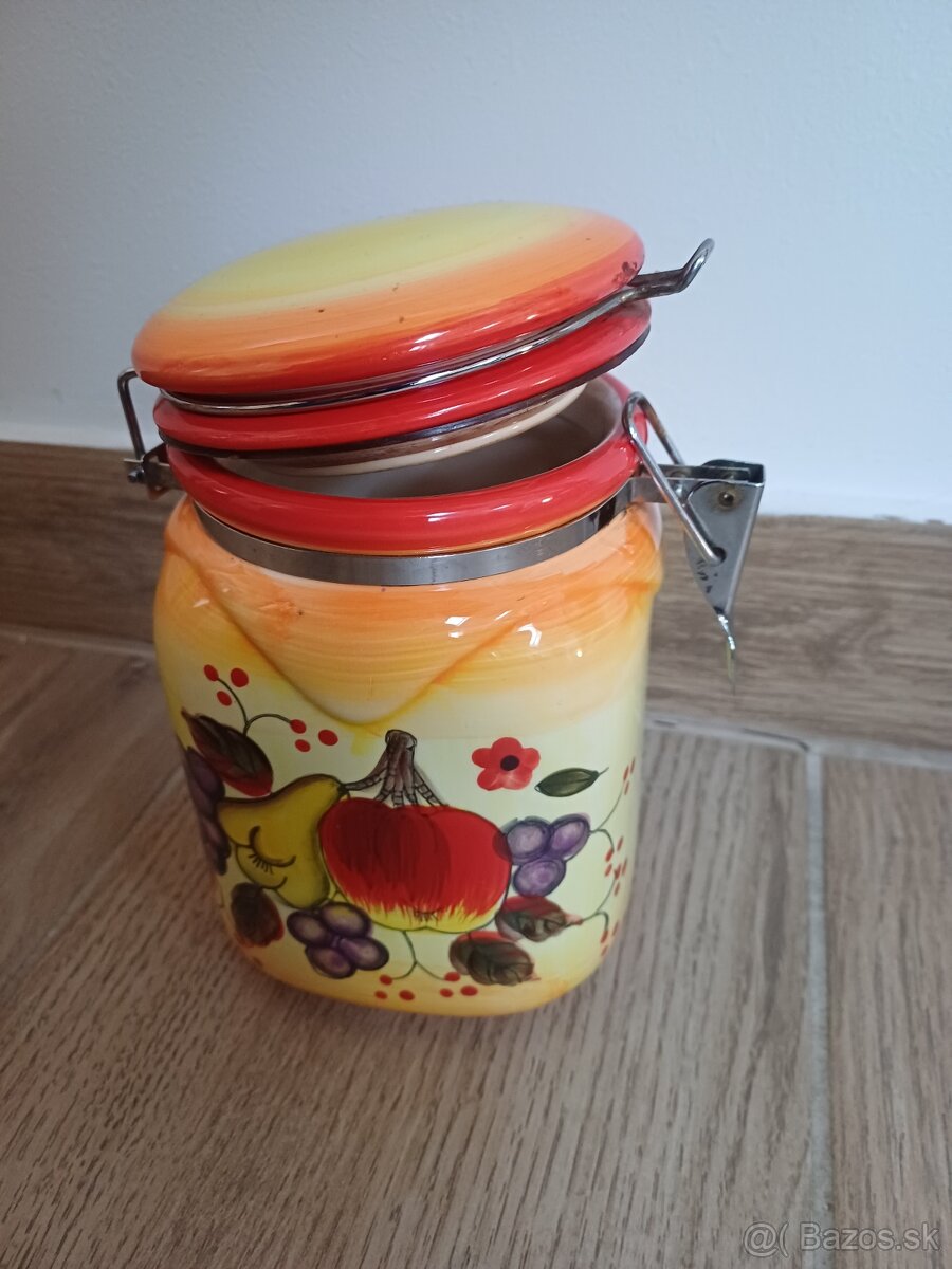 Predám keramickú nádobu s vrchnákom s tesnením. Rozmery: výška 17cm, šírka: 11 x11 cm, priemer otvoru je 9cm, objem cca 1l.