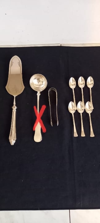 Predám strieborné lyžičky,naberačku na dortu, omáčnik,klieštiny na cukor. Cena na obr. Osobný odber v Ba.Omáčnik predaný.