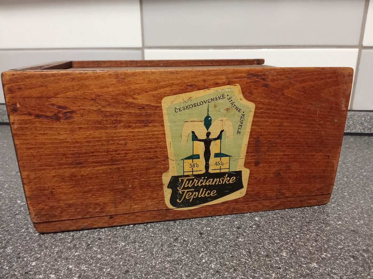 Drevena skrinka, cca 50. roky 20. stor., povodny stav. Pochadza z vtedajsich Ceskoslovenskych statnych kupelov Turcianske Teplice, sluzila ako pokladnicka.