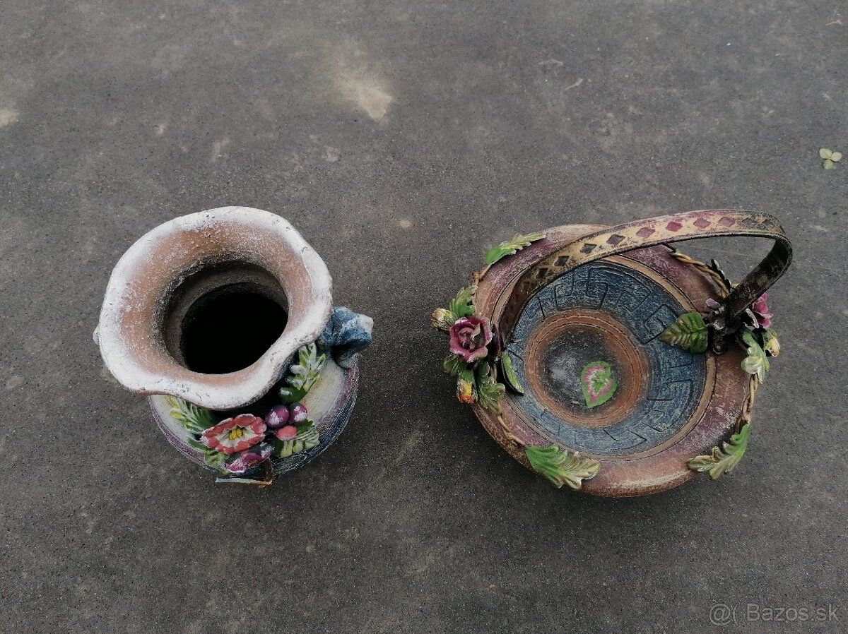 Predám keramickú vázu a košík. Pekné reliéfne 3D kvetinové a listové motívy. Výška vázy 21cm, výška košíka 23cm, priemer 24cm. Cena spolu 15€