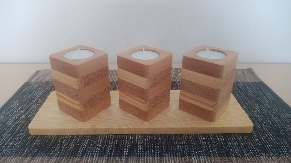 Predám sadu 3ks drevených svietnikov na čajové sviečky s podstavcom. Svietniky sú vyrobené z 2 druhov dreva - buk a smrek (resp. borovica). Podstavec je zo smreku resp. borovice. Povrch je ošetrený olejom na drevo. Rozmery 1 svietnika sú 5,5x5,5x9cm. Rozmery podstavca sú cca 30x10x1,2cm. Možný aj osobný odber. Cena je 15,- +poštovné a dobierka.