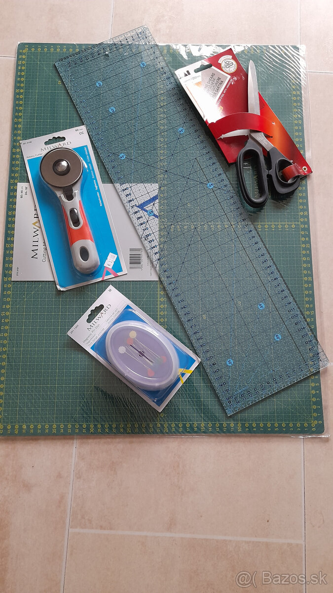 Set: rezacia podložka 60x45 cm,rezač na látky Milward priemer 60 mm, magnetický ihelníček, pravítko 15x60 cm,nožnice Kai japonská kvalita 21 cm- spolu 60€.