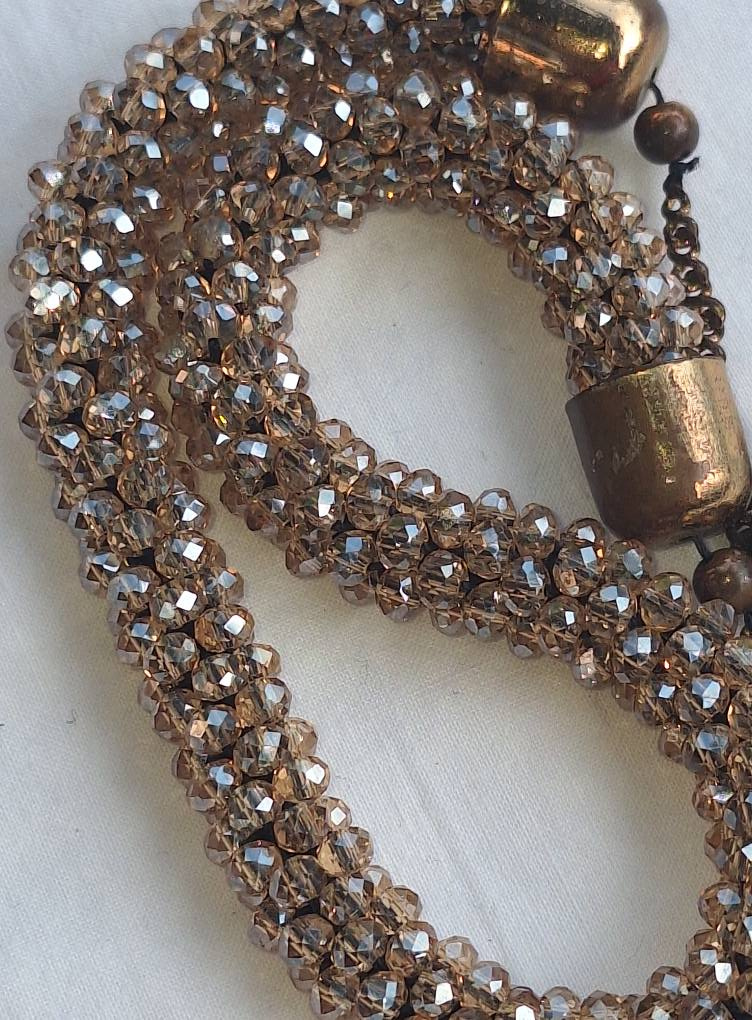 Starší náhrdelník drobné korálky sklo brúsené aurora borealis, kov v medenej farbe už je trošku oxidovany. FLAME. d max 54 cm cena 6 eur plus poštovné