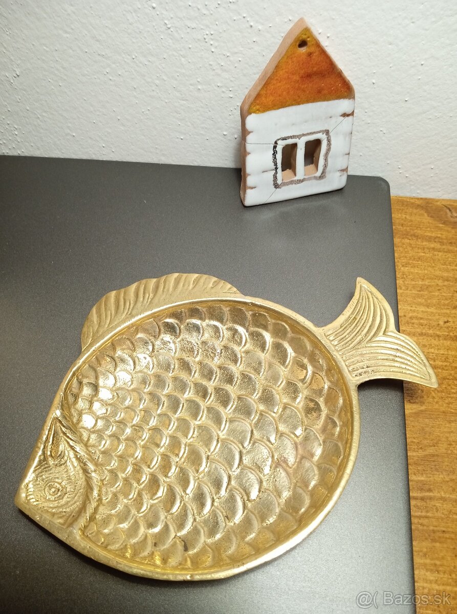 Mosadzna miska v tvare ryby. Tieto misky prekonávajú trendy a nikdy nestarnú! Sú veľmi originálne a kvalitne vyrobené, celé z mosadze. Rýchlo si nájdu svoje miesto na komode v predsieni, alebo na príručnom stolíku v obývačke.