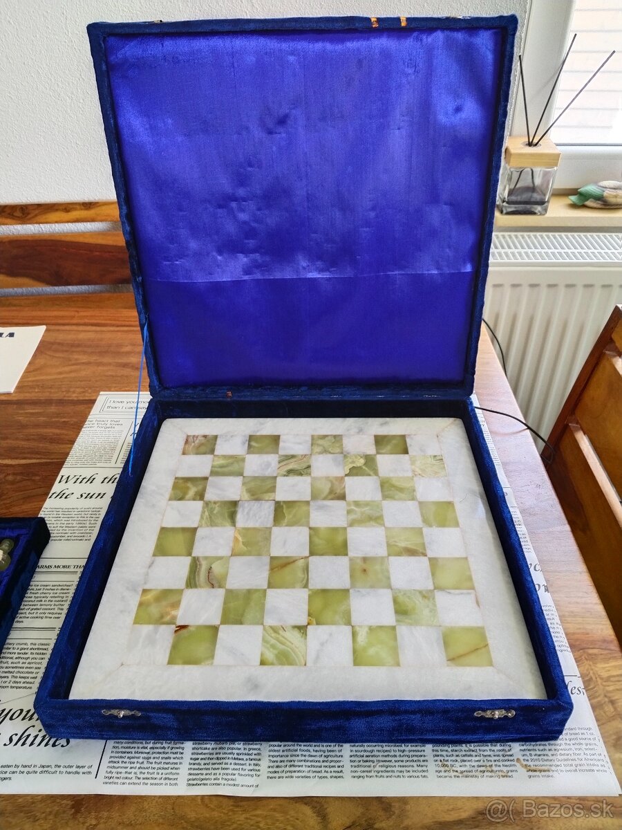 Celá šachová hra s masivní deskou o rozměrech 40x40x1 cm, je kusem přírodní krásy, pečlivě vyrobena buď z onyxu, nebo z amazonitu, minerálů známých pro své jedinečné a podmanivé žilkování. Každé políčko je malým světem samo pro sebe – bílá políčka září čistým, mramorovým jasem, jejich jemné šedé žíly šeptají příběhy starých hor. Tmavá políčka, zářivě zelená s bohatými, zemitě hnědými a jantarovými pruhy, vyvolávají pocit sluncem zalitého lesního dna, živé mozaiky z kamene. Hmotnost celé sestavy 8,94 kg svědčí o její substanci a trvanlivosti.