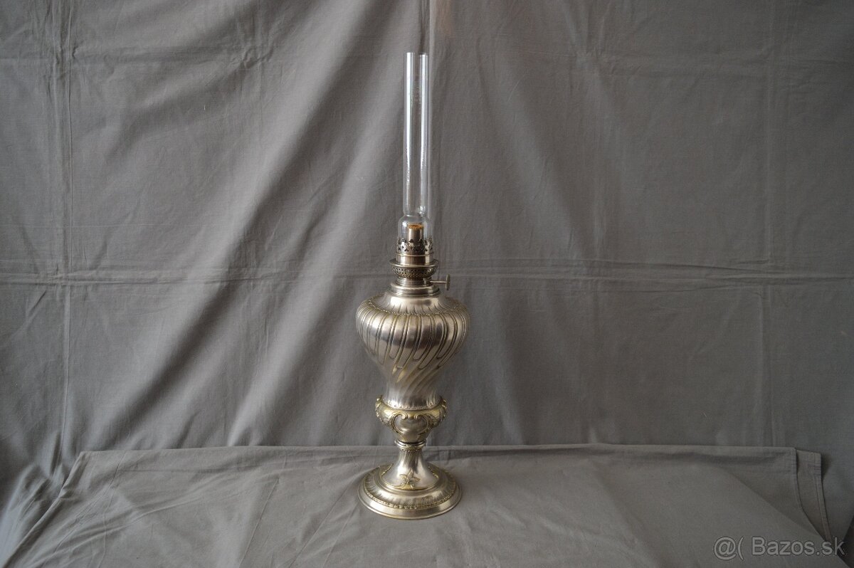 Zač. 20.st., postriebrená mosadz, výška so sklom 60cm, bez 38cm, priemer podstavca 15cm, váha 2,5kg, pozrite všetky moje inzeráty