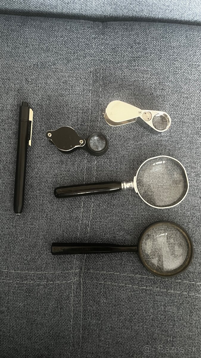 Predám sadu lúp – spolu 5 kusov (2x klasická lupa s rúčkou, 2x skladacia lupa, 1x pero).
