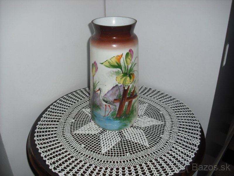 Predám starožitnú sklenenú vázu s ručnou malbou(krajinka s bocianom).Výška vazy 29cm.